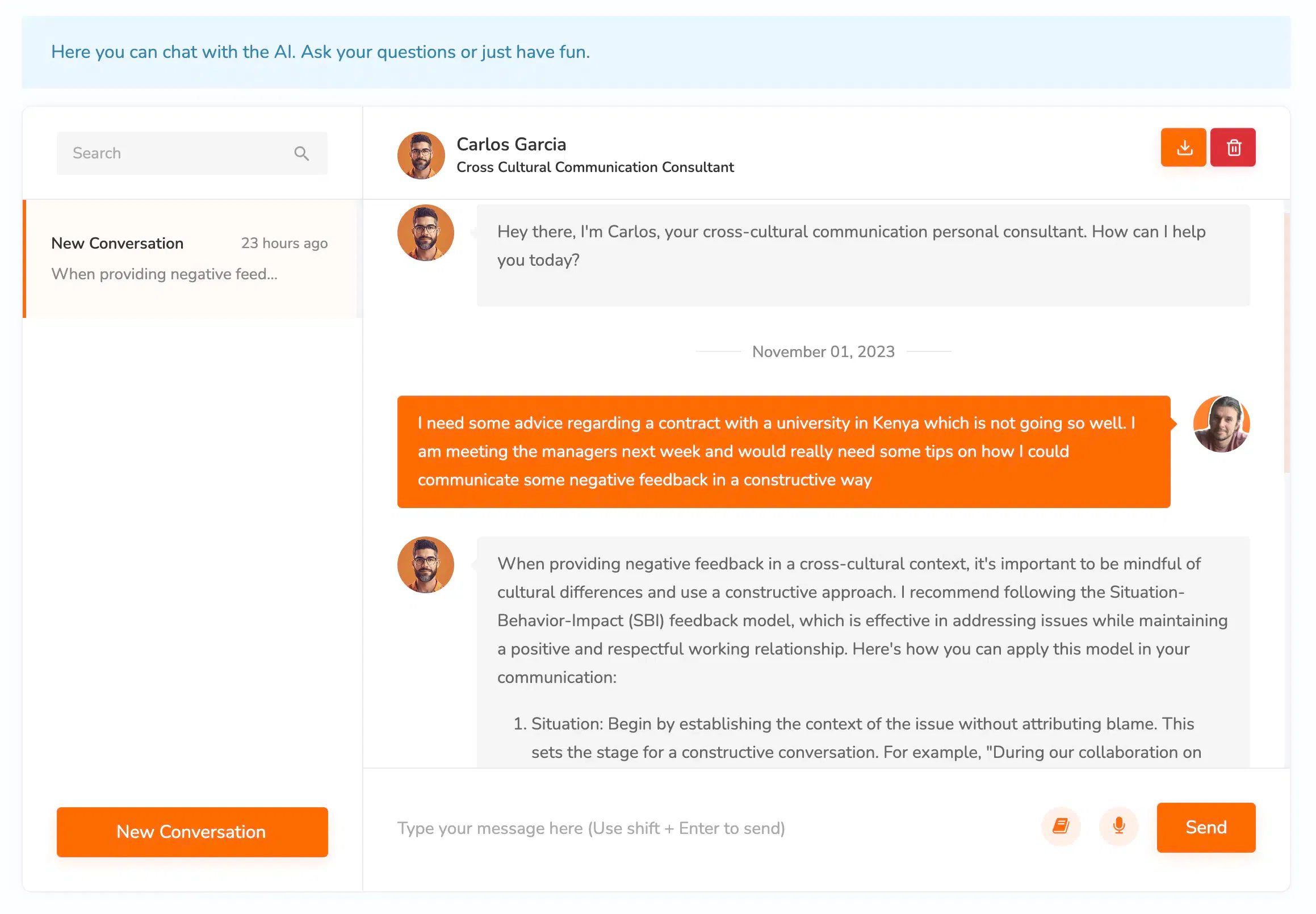 Your very own, 24/7 available Co-Pilots provide you with personalised and specialised conversations and interactions. Choose from a variety of specialised consultants in management, communication, technology, travel, complaints, and career progression. Easily save and export conversations from your dashboard.