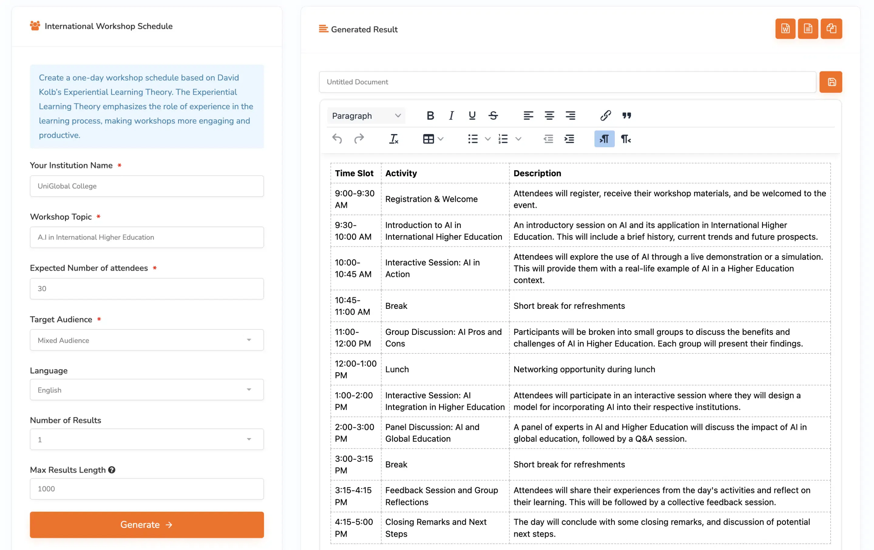 Create a one-day workshop schedule based on David Kolb’s Experiential Learning Theory. The Experiential Learning Theory emphasizes the role of experience in the learning process, making workshops more engaging and productive.