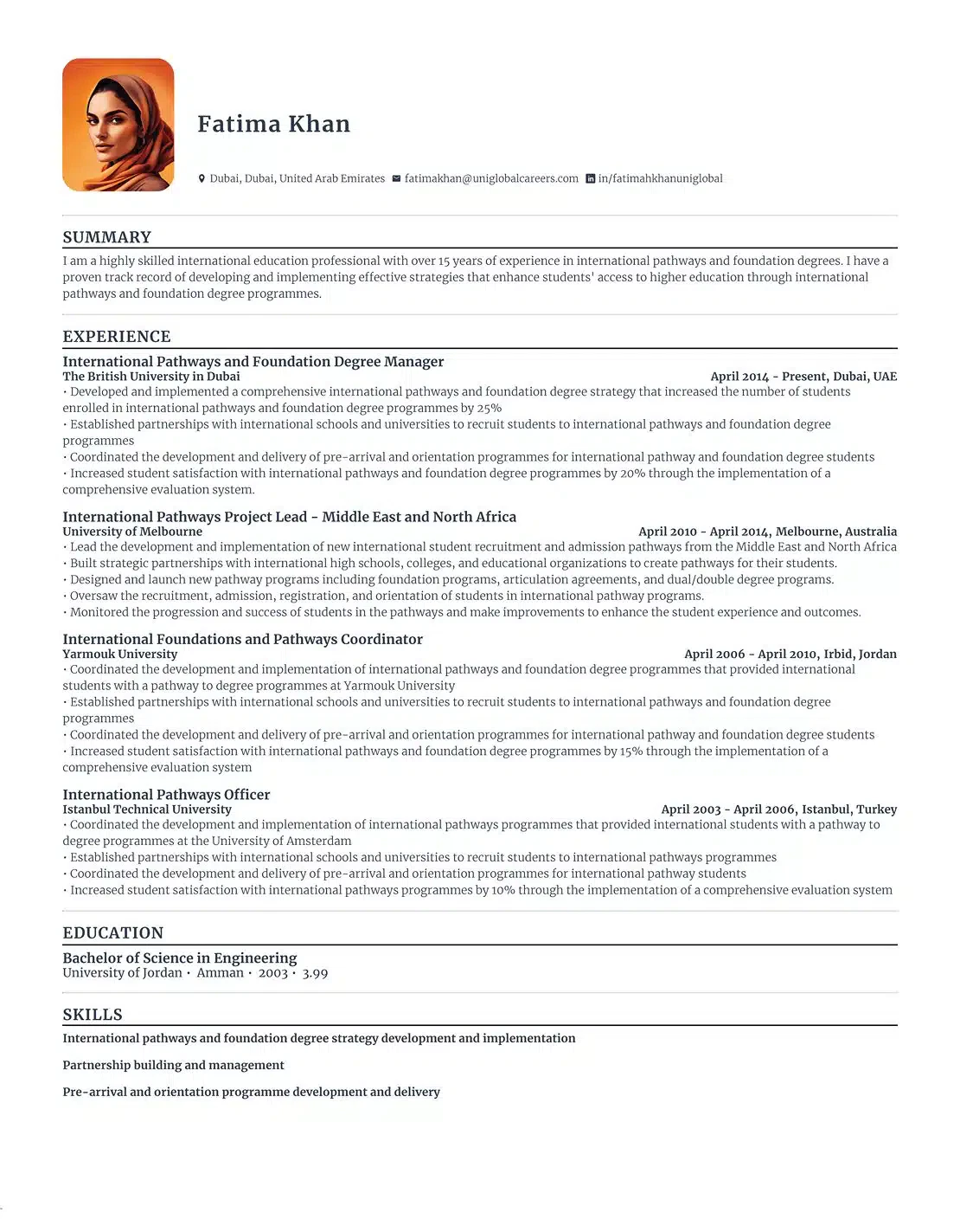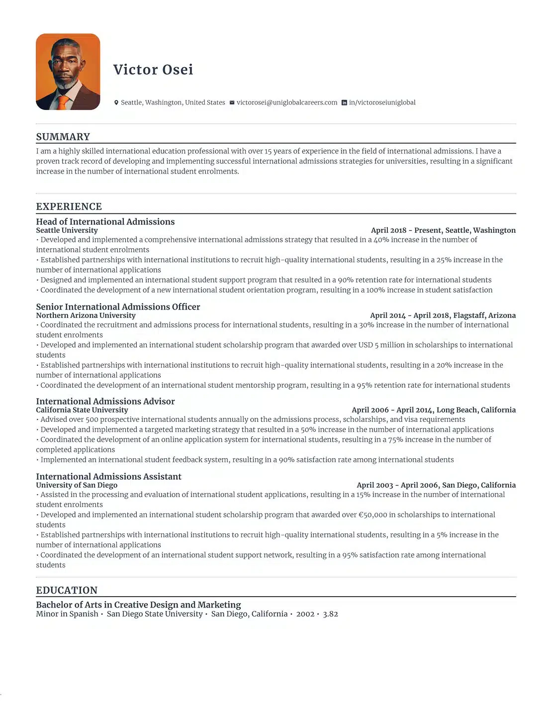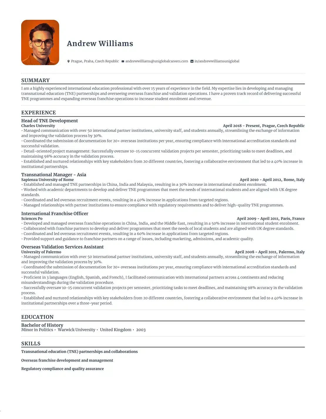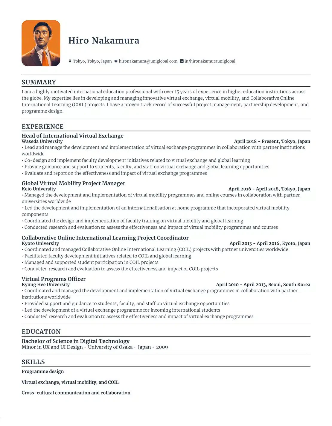 “UniGlobal revolutionized the way I approach job hunting. The automatic formatter gave my CV a professional look, while the AI-powered writer developed a spot-on cover letter based on my individual profile. Truly remarkable!” – Brian K.